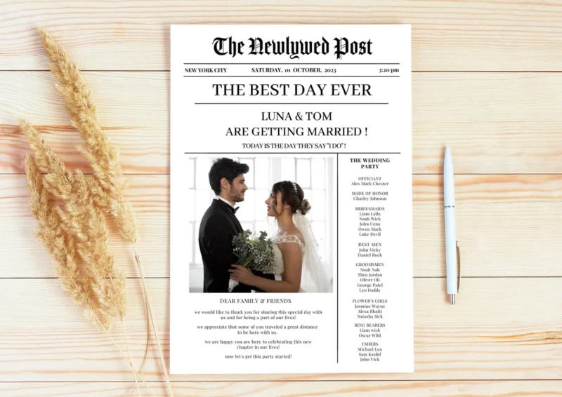 Looking for a unique wedding program? This Folded Newspaper Wedding Program Template is just what you need! It features a timeline of events and is easy to customize to match your wedding theme.